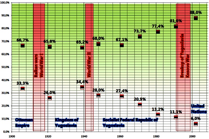 Změny podílu dvou nejpočetnějších etnik na celé kosovské populaci ve 20. století