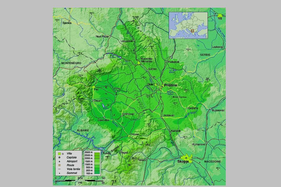 Samotné Kosovo se rozkládá na východě a leží v něm hlavní město Priština a Kosovo pole, místo na kterém se v roce 1389 odehrála významná bitva mezi Osmanskou říši a Srbskem se spojenci.